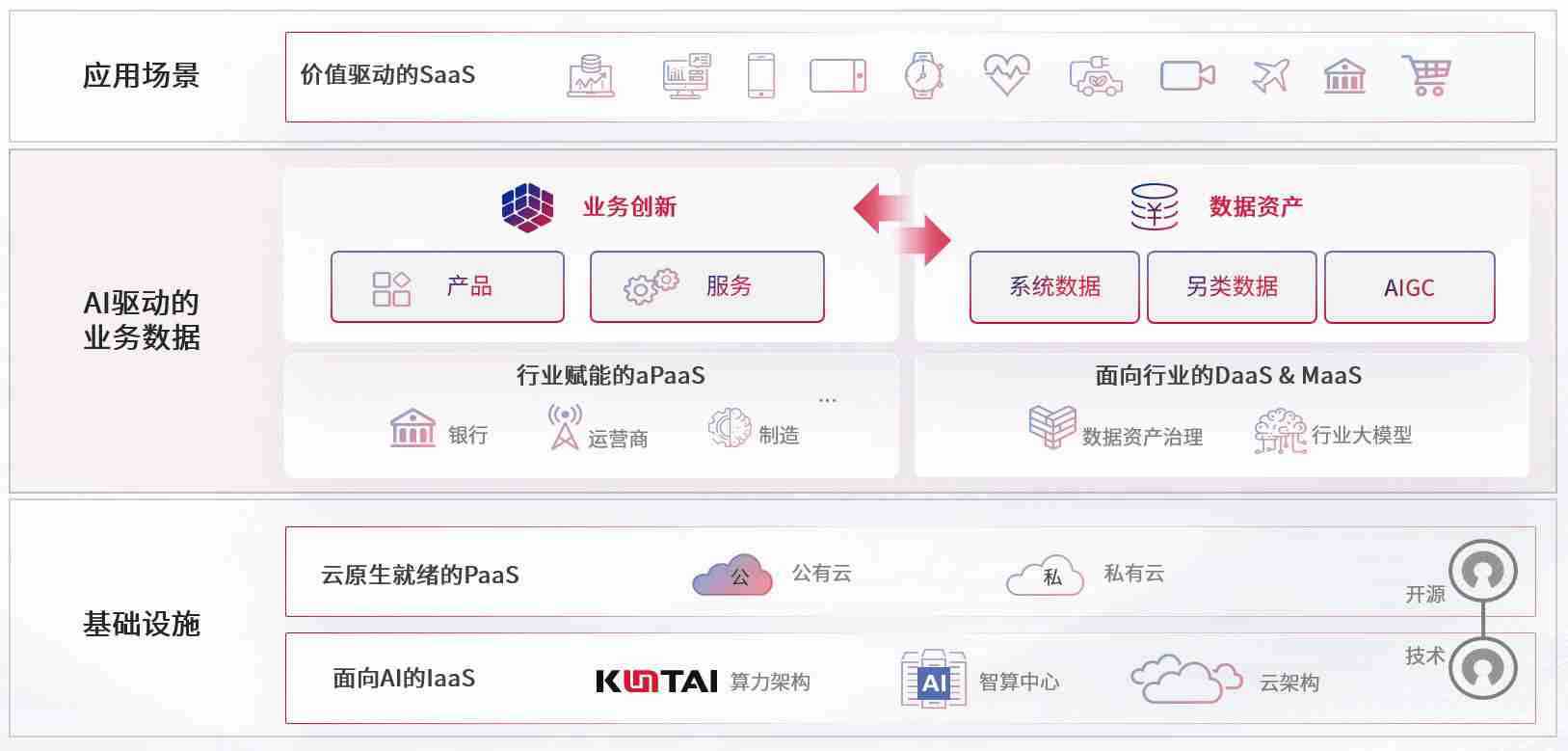 数字时代,,,,围绕企业数字化转型的关键要素,,J9娱乐数码开创性的提出数云融合战略和技术体系框架,,,,着力在云原生、、、数字原生、、、、AI原生和信创产业上架构产品和服务能力,,,,为处在不同数字化转型阶段的快消零售、、、、汽车、、、金融、、、、医疗、、、政企、、、教育、、、运营商等行业客户提供泛在的敏捷IT能力和融合的数据驱动能力,,,构建跨界融合创新的数字业务场景和新业务模式,,,,助力企业级客户建立面向未来的核心能力和竞争优势,,,,全面推动社会的数字化、、智能化转型升级。。
