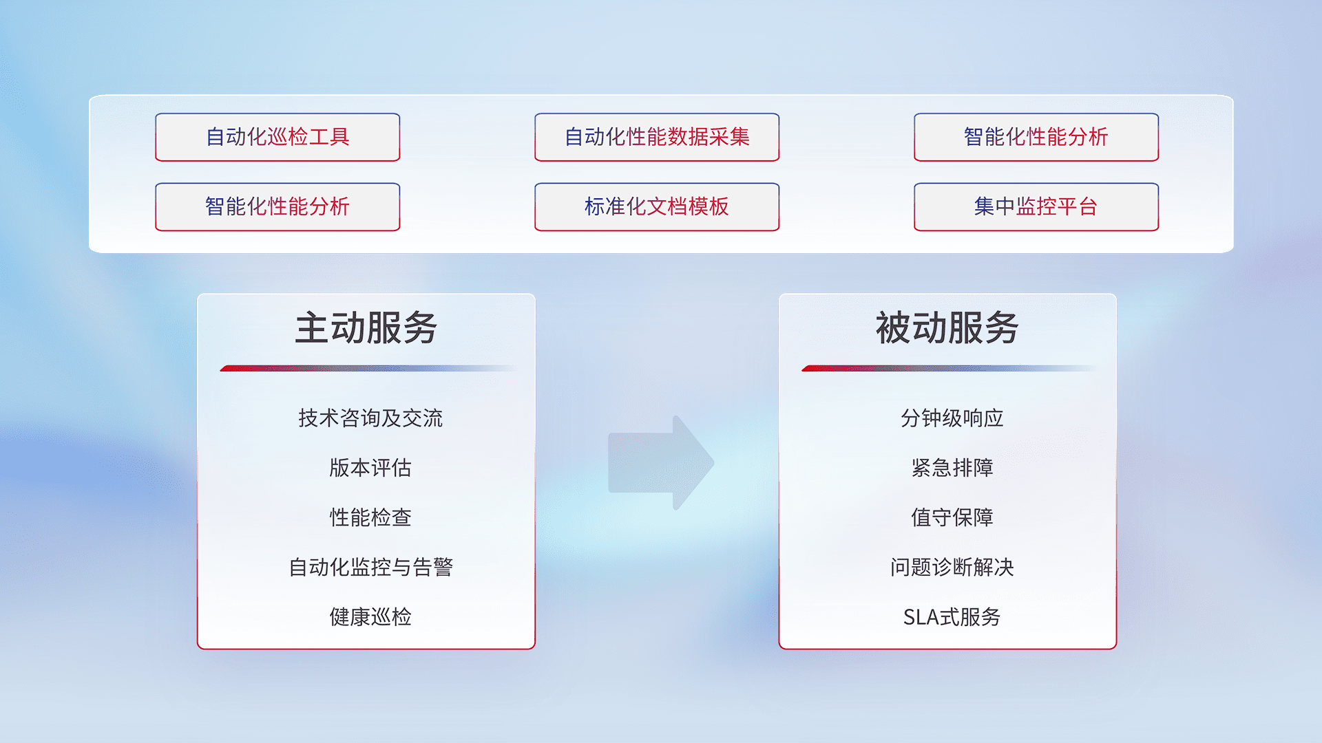 智能化工具和标准化文档,,保障服务质量,,提供主动服务(包含技术咨询、、、、版本评估、、性能检查、、、、自动化监控与告警、、、健康巡检)和被动服务包含(分钟级响应、、、紧急排障、、、值守保障、、、、问题诊断解决、、、、SLA服务)。。。。